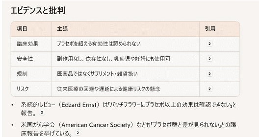 - 系統的レビュー(Edzard Ernst)は「バッチフラワーにプラセボ以上の効果は確認できない」と報告。