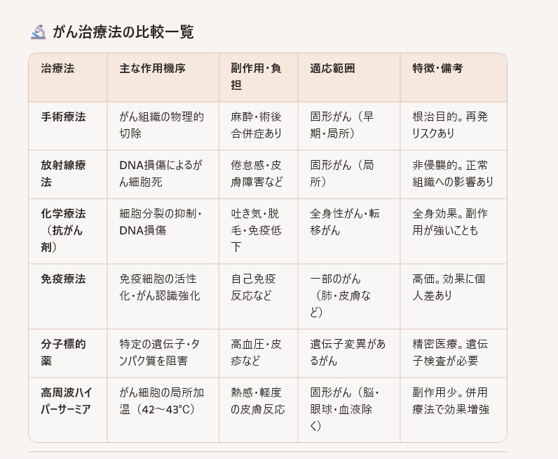 がん治療には多様な選択肢があり、それぞれに作用機序・副作用・適応範囲・治療目的が異なります。以下に「高周波ハイパーサーミア療法」と主要ながん治療法との比較をまとめました。