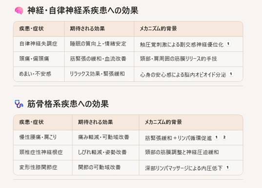 🌸 日本さくら式整体は、特定の疾患に対して直接「治療」するものではありませんが、以下のような症状緩和・回復促進の補完的効果が報告されています。科学的根拠や臨床的観察を踏まえて、疾患別に整理してみましょう: