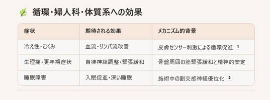 この整体法は、疾患名に対する治療ではなく、症状の背景にある筋緊張・循環障害・神経過敏にアプローチする補完療法として位置づけられます。特に、病名がつかない不調(未病)や慢性症状に対して、患者の実感レベルで効果が報告されている点が特徴です。