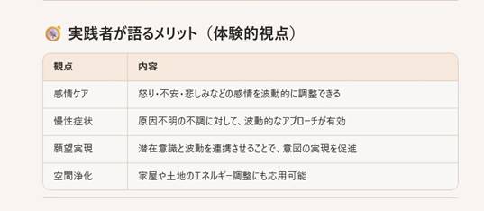 - 使用者の意図や集中力が波動に影響するため、自己治癒力や潜在意識の活性化につながる。