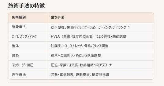 他療法と比較すると、整骨療法は「国家資格者による急性外傷の応急処置」「保険適用の明確さ」「非侵襲的かつ医学的根拠に基づく手技」が大きな特徴です。逆に慢性痛や全身バランス調整を主目的とする場合には、整体やカイロ、鍼灸などが選択肢となります。