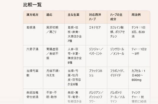 以下に代表的な漢方処方と対応する西洋ハーブをまとめます。まずは一覧表で全体像を示し、その後に各ペアのメカニズムや用法を解説します。