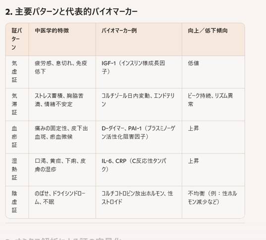 以下では「証」と呼ばれる中医学的な体質・病態パターンと、現代医学で計測可能なバイオマーカーとの対応関係を概観します。