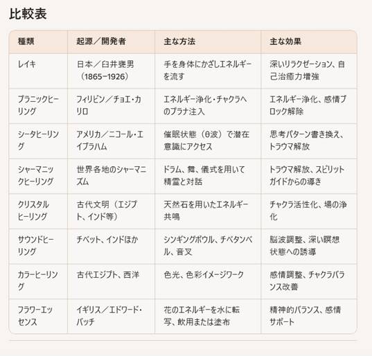 以下では代表的なヒーリング手法を一覧し、起源や方法、特徴を詳しく解説します。