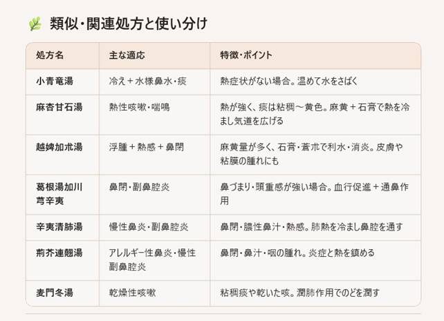 もしご希望なら、「小青竜湯/小青竜加石膏湯/麻杏甘石湯」など類似処方の比較マトリクスを作って、症状別の選び分けフローチャートにまとめることもできます。