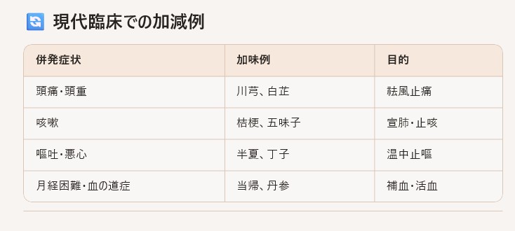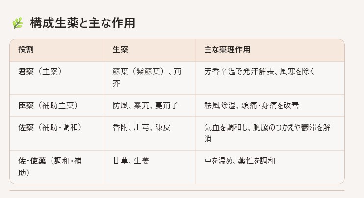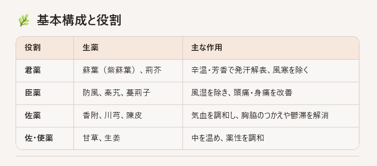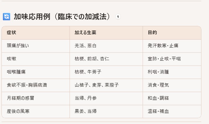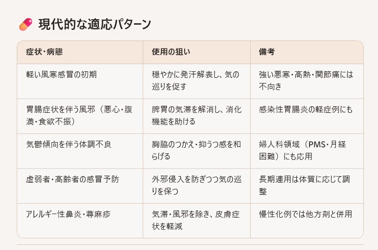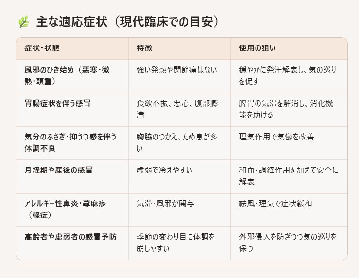 古典的には「風寒感冒の初期」に使われますが、現代では精神面や消化器症状を伴うケースにも応用されています。