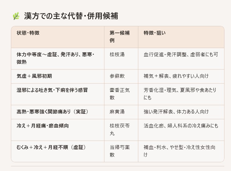 加味香蘇散が合わない場合や、症状・体質が異なる場合には、漢方・西洋薬・生活養生など複数の選択肢があります。