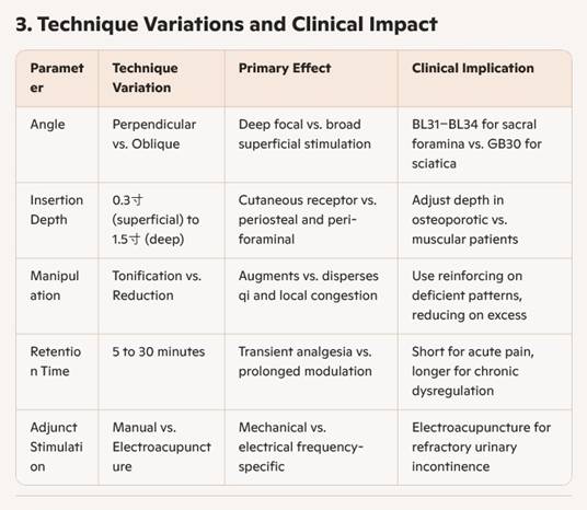 techniques, depth, manipulation, and adjunct therapies (moxibustion,